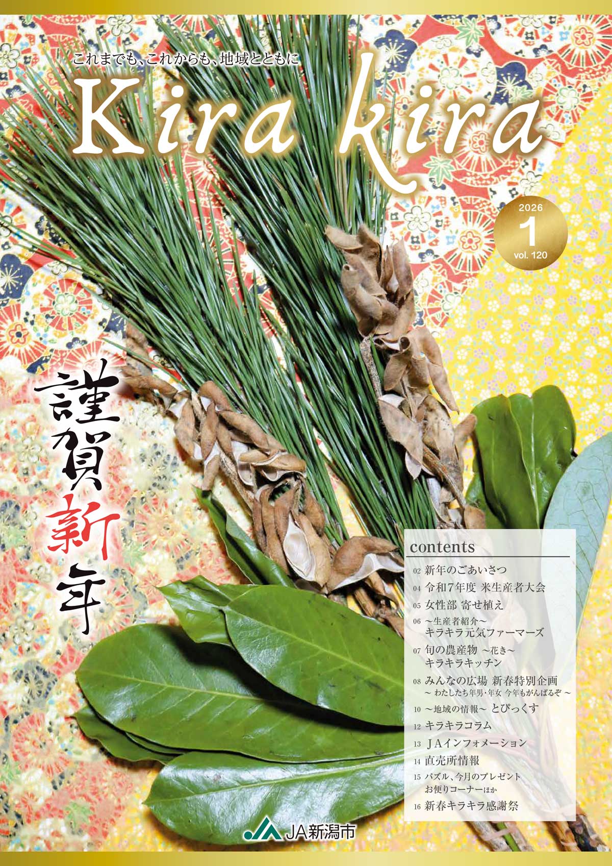 Kira kira 2026年1月号 Vol.120 CONTENTS 新年のごあいさつ 令和7年度 米生産者大会 女性部 寄せ植え ~生産者紹介~キラキラ元気ファーマーズ 旬の農産物~花き~キラキラキッチン みんなの広場 新春特別企画~ わたしたち年男・年女 今年もがんばるぞ ~ ~地域の情報~とぴっくす キラキラコラム JAインフォメーション 直売所情報 パズル、今月のプレゼント お便りコーナーほか 新春キラキラ感謝祭 Kira kira 2025 Vol.118 広報誌2026.01.15