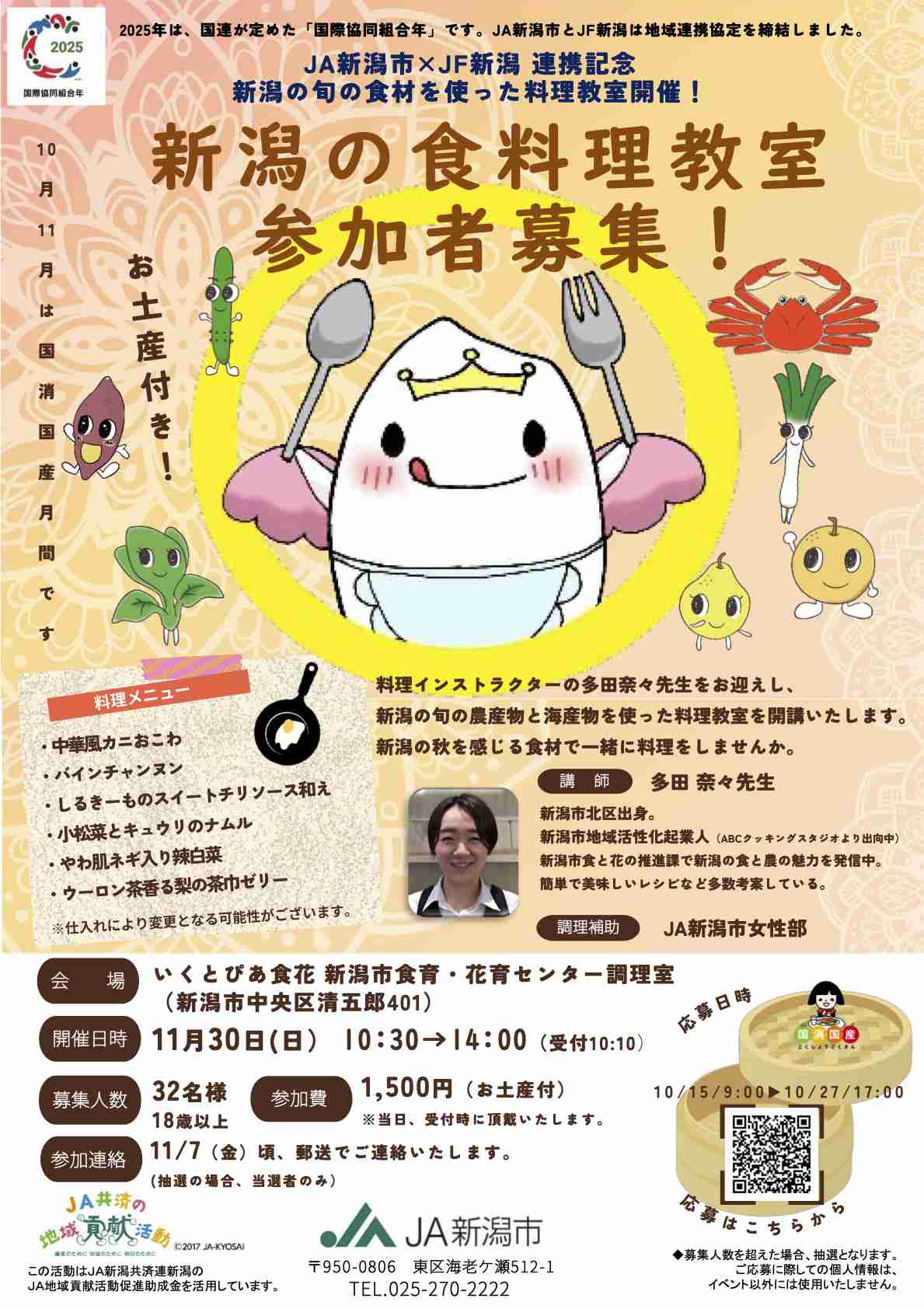 JA新潟市×JF新潟の連携記念として、料理インストラクターの多田奈々先生をお迎えし、新潟の旬の農産物と海産物を使った料理教室を開講いたします。