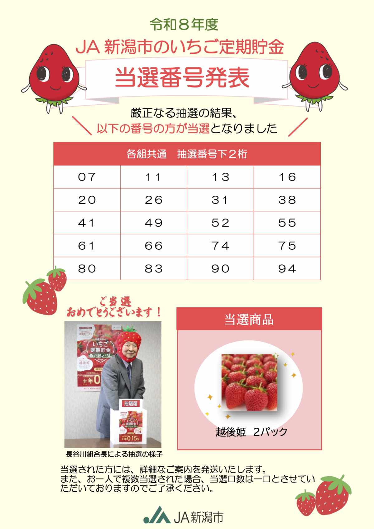令和8年度JA新潟市のいちご定期貯金 当選番号発表