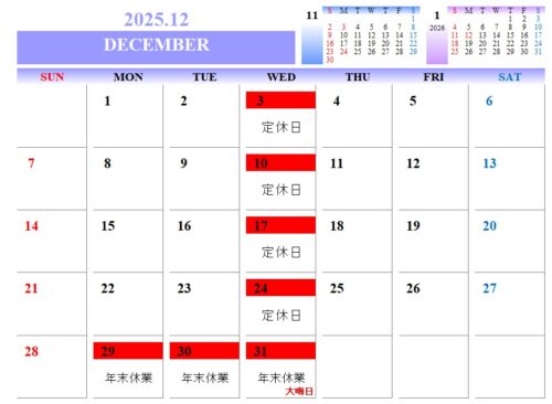 年末年始 12月29日(月)~ 2026年1月3日(土)