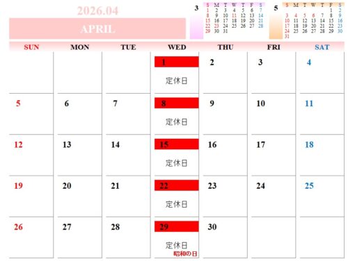 定休日 毎週水曜日 1日、8日、15日、22日、29日(昭和の日)